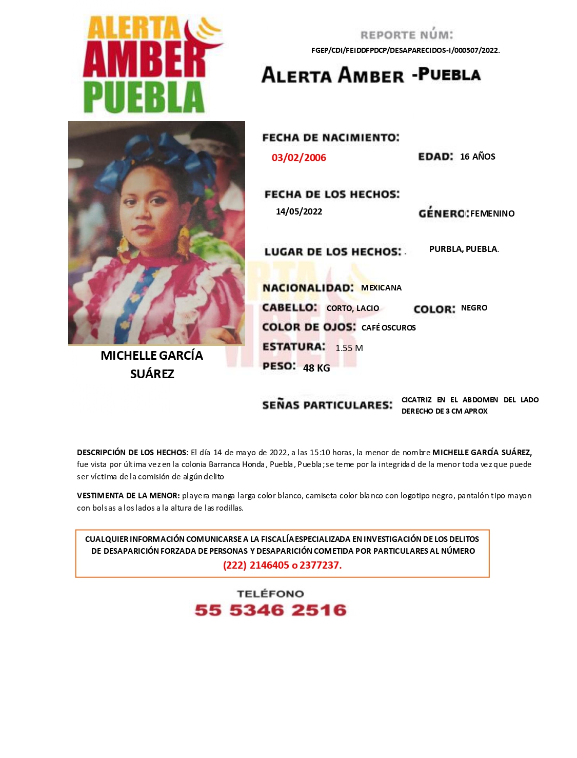 Fiscalía de Puebla activa Alerta AMBER de la menor Michelle García Suárez 16 años de edad, vista por última vez en la colonia Barranca Honda, Puebla.
