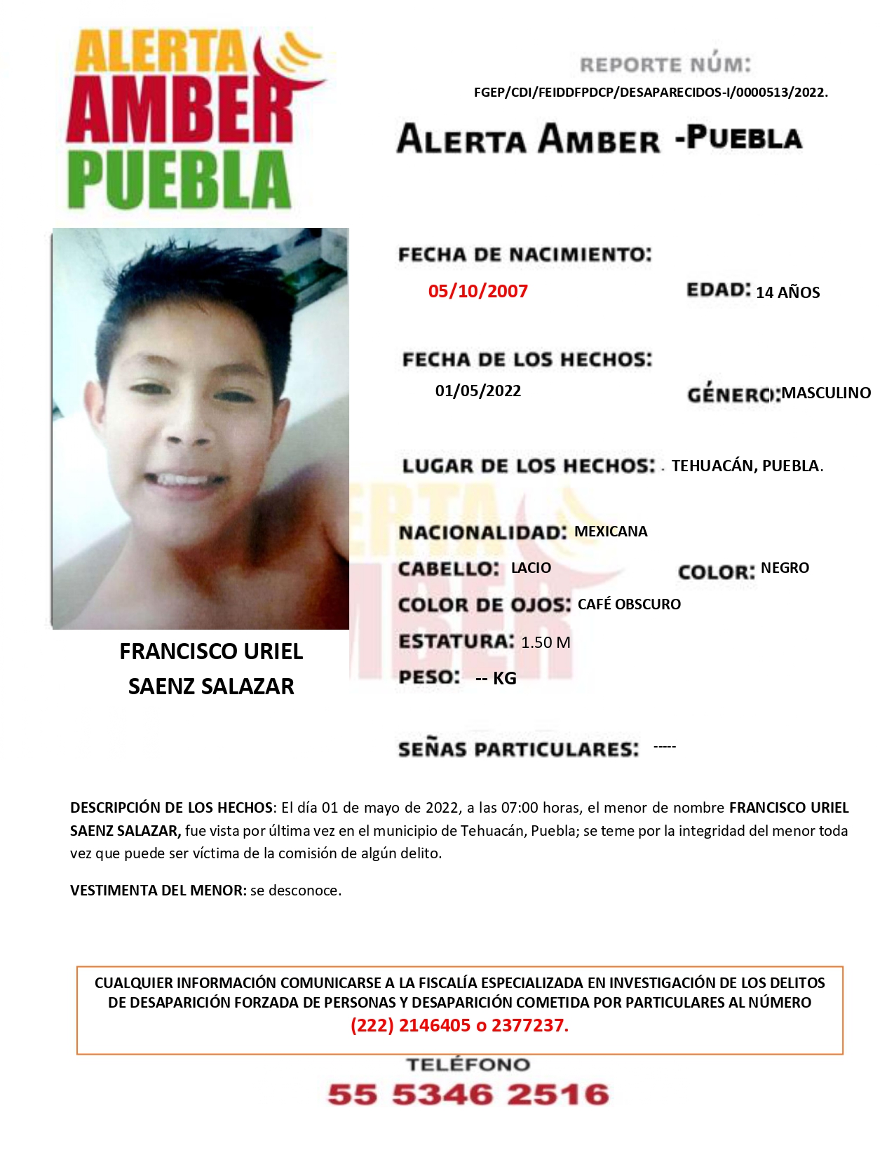 Fiscalía Puebla activa Alerta AMBER de Francisco Uriel Saenz Salazar de 14 años de edad, visto por última vez en el municipio de Tehuacán.