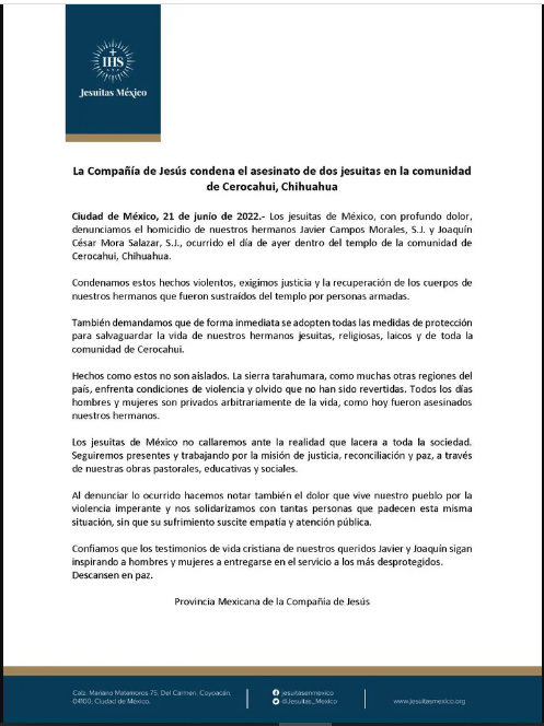 “La sierra tarahumara, como muchas otras regiones del país, enfrenta condiciones de violencia y olvido que no han sido revertidas. Todos los días hombres y mujeres son privados arbitrariamente de la vida, como hoy fueron asesinados nuestros hermanos”