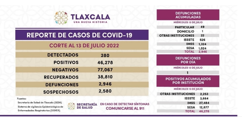 En total, durante la pandemia han muerto 2 mil 946 habitantes y se han contagiado 46 mil 278, tan solo ayer dieron positivo 280 más.