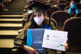 Durante la ceremonia de graduación de 190 egresados de la Licenciatura en Químico Farmacobiólogo, en la que fungió como madrina de generación