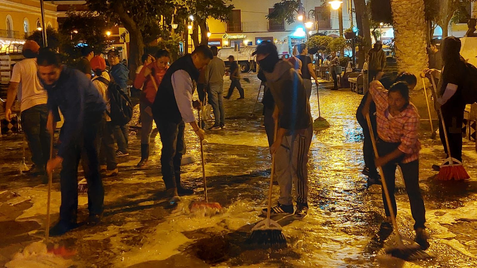 En estos momentos, servidores públicos del ayuntamiento de Atlixco, prestadores de servicios y ciudadanos, encabezados por la presidenta municipal, Ariadna Ayala realizan limpieza del zócalo de la ciudad, a dos días de iniciar la #FeriaDeAtlixco2023.