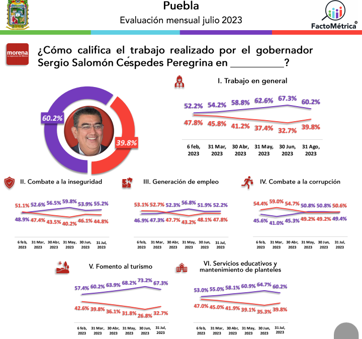Este análisis de Factométrica detalló que el 52.2 por ciento de los poblanos respaldó la política del gobierno estatal en materia de generación de empleos, mientras un porcentaje más elevado, el 55.2%, hizo lo propio en el rubro de combate a la inseguridad. Cierto: Son evaluaciones muy favorables, principalmente si se toma en cuenta que se trata de aristas muy importantes y que, a nivel nacional, están envueltas en una grave crisis, como la inseguridad.