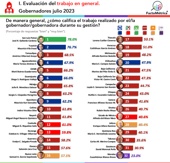Este trabajo demoscópico de Factométrica ratificó lo que todos los mexicanos sabemos: Que los gobernadores peor calificados del país son el americanista Cuauhtémoc Blanco (Morelos, 23% de aprobación), David Monreal Ávila (Zacatecas, 30.9 por ciento) y Carlos Merino Campos (Tabasco, 35.6%).