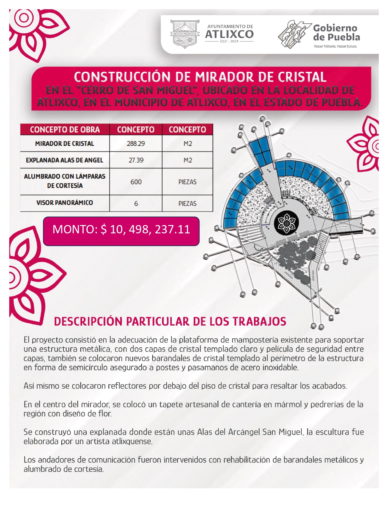 La obra consta de un mirador de cristal de 288 metros cuadrados, explanada alas de ángel (27.39 m2), 600 lámparas de cortesía y 6 visores panorámicos. Su construcción se anunció en octubre del año pasado, aunque comenzó en febrero del 2023 y se trata de un trabajo conjunto entre el ayuntamiento atlixquense y la administración estatal actual.