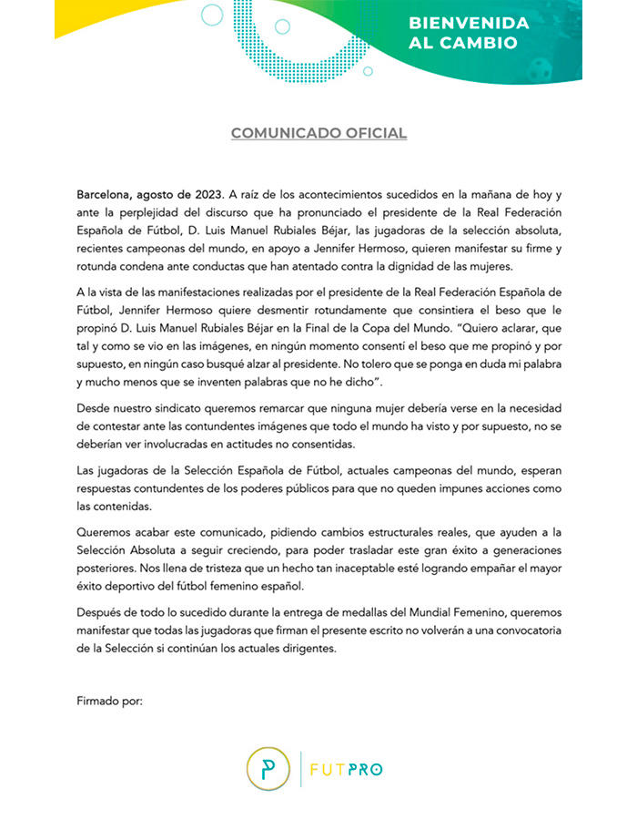 Las 23 jugadoras internacionales que se proclamaron campeonas del Mundial femenino de FIFA en Australia y Nueva Zelanda este mes de agosto, anunciaron en un comunicado lanzado por su asociación FutPro, su renuncia a seguir acudiendo a las convocatorias de la selección mientras Luis Rubiales se mantenga como presidente de la Real Federación Española de Fútbol (RFEF).