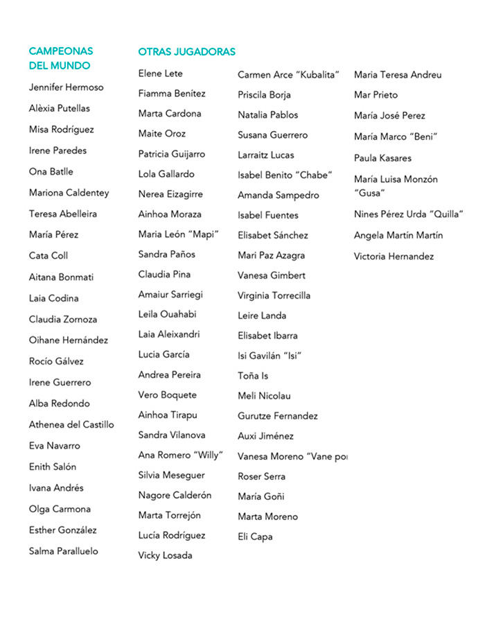 Además, respaldan el comunicado las siguientes futbolistas: Mapi León, Patricia Guijarro, Lola Gallardo, Nerea Eizagirre, Ainhoa Moraza, Sandra Paños, Claudia Pina, Amaiur Sarriegi, Leila Ouahabi, Laia Aleixandri, Lucia García, Andrea Pereira, Vero Boquete, Ainhoa Tirapu, Sandra Vilanova, Ana Romero “Willy”, Silvia Meseguer, Nagore Calderón, Carmen Arce “Kubalita”, Priscila Borja, Natalia Pablos, Susana Guerrero, Larraitz Lucas, Isabel Benito, Amanda Sampedro, Isabel Fuentes, Elisabet Sánchez, Mari Paz Azagra, Vanesa Gimbert, Virginia Torrecilla, Leire Landa, Elisabet Ibarra y Marta Torrejón.