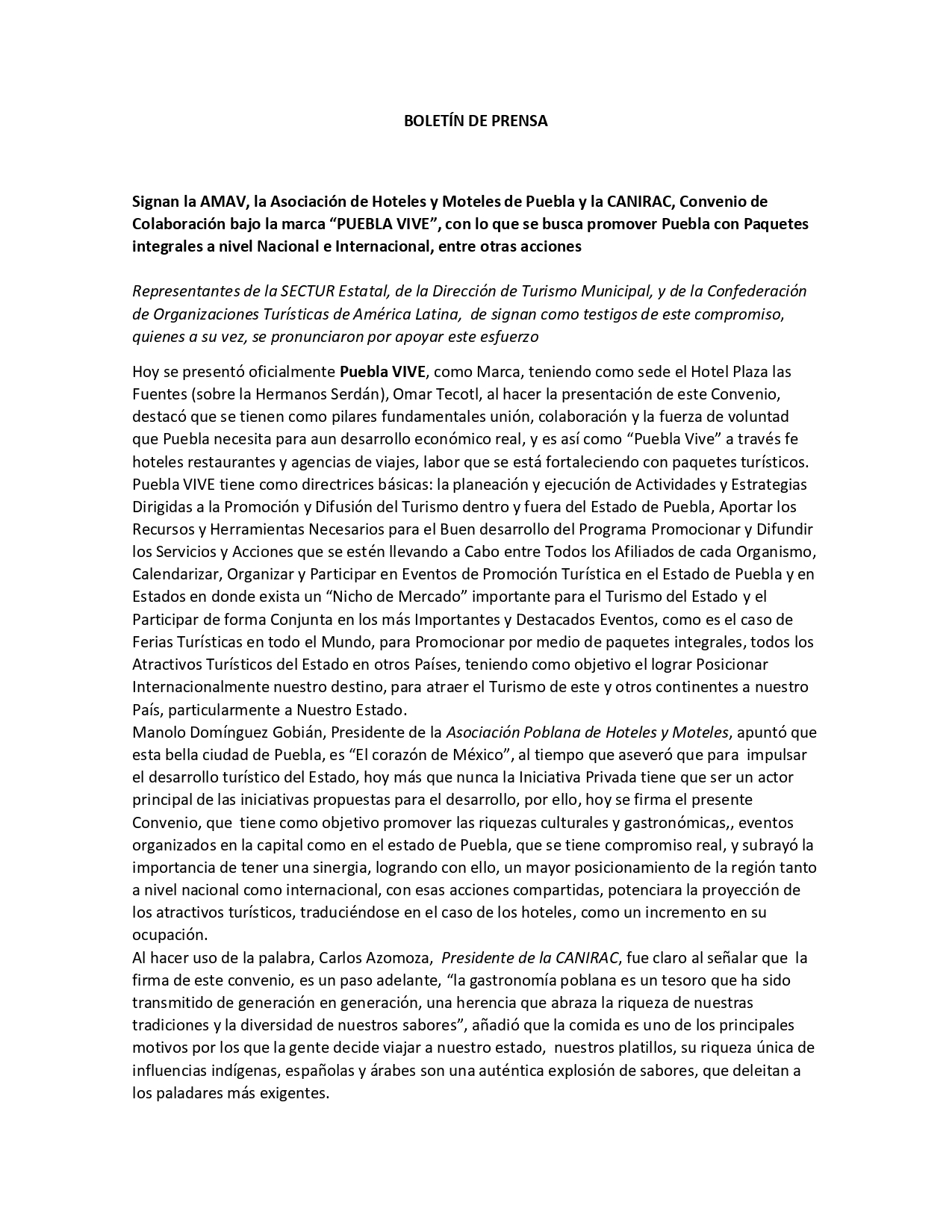 Signan la AMAV, la Asociación de Hoteles y Moteles de Puebla y la CANIRAC, Convenio de Colaboración bajo la marca “PUEBLA VIVE”, con lo que se busca promover Puebla con Paquetes integrales a nivel Nacional e Internacional, entre otras acciones