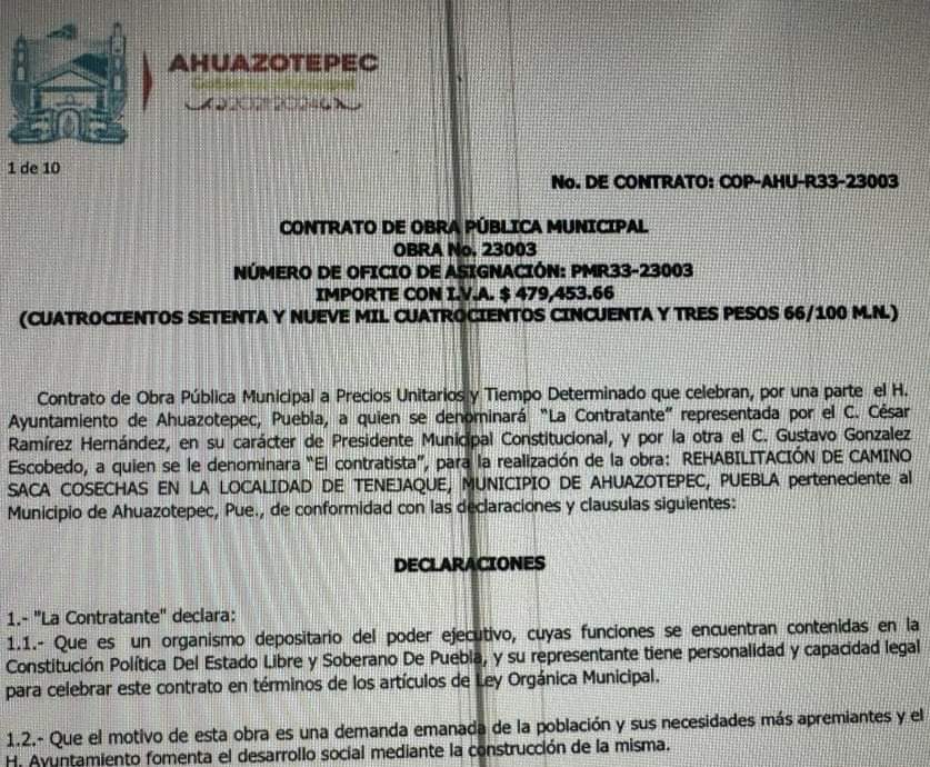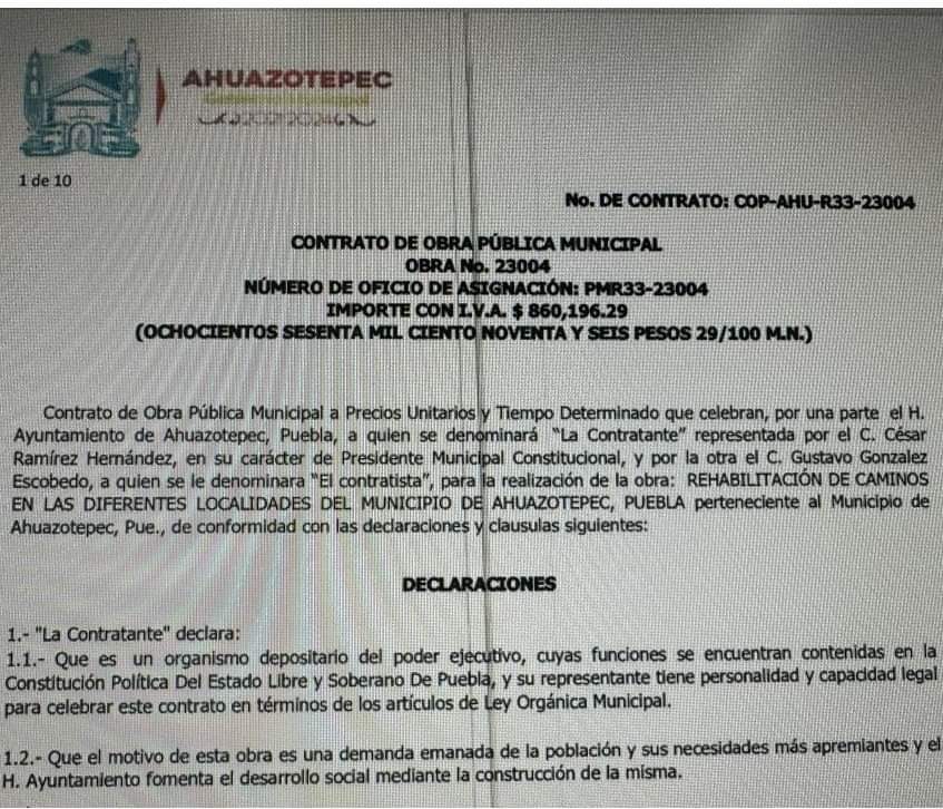 Otro con el No. De Contratos: COP- AHU-R33-23004 con la empresa denominada “La Contratante” representada Cesar Ramírez Hernández, en su carácter de presidente municipal y por la otra C. Gustavo González Escobedo a quien se les domina “El contratistas”, para realizar la obra “Rehabilitación de Caminos en las diferentes localidades del municipio de Ahuazotepec”, con una inversión de 860 mil 196 pesos 29 centavos.