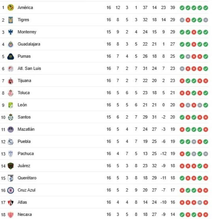 Mientras que los Rojinegros y los Rayos se despidieron de toda posibilidad de pelear por el título al acumular 16 y 14 unidades en el decimoséptimo y decimooctavo escalón, respectivamente.