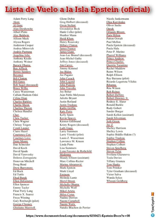 Entre algunos otros de los nombres que también aparecen se encuentra Beyoncé con su marido Jay-Z, Rihanna, Alec Baldwin, Katy Perry, Lady Gaga, Madonna, Miley Cyrus, entre otros, de acuerdo a la lista divulgada en redes sociales como «X».
