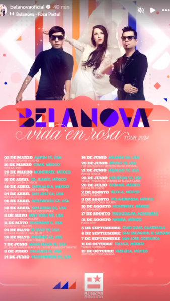 Hace algunas horas Belanova anunció su presentación en Toluca, Estado de Méxic, pero ahora la agrupación de electro pop ya dio a conocer todas sus fechas para el tour de 2024, el nombre de la gira es Vida en rosa y su primera presentación será en el Festival Bésame Mucho.
