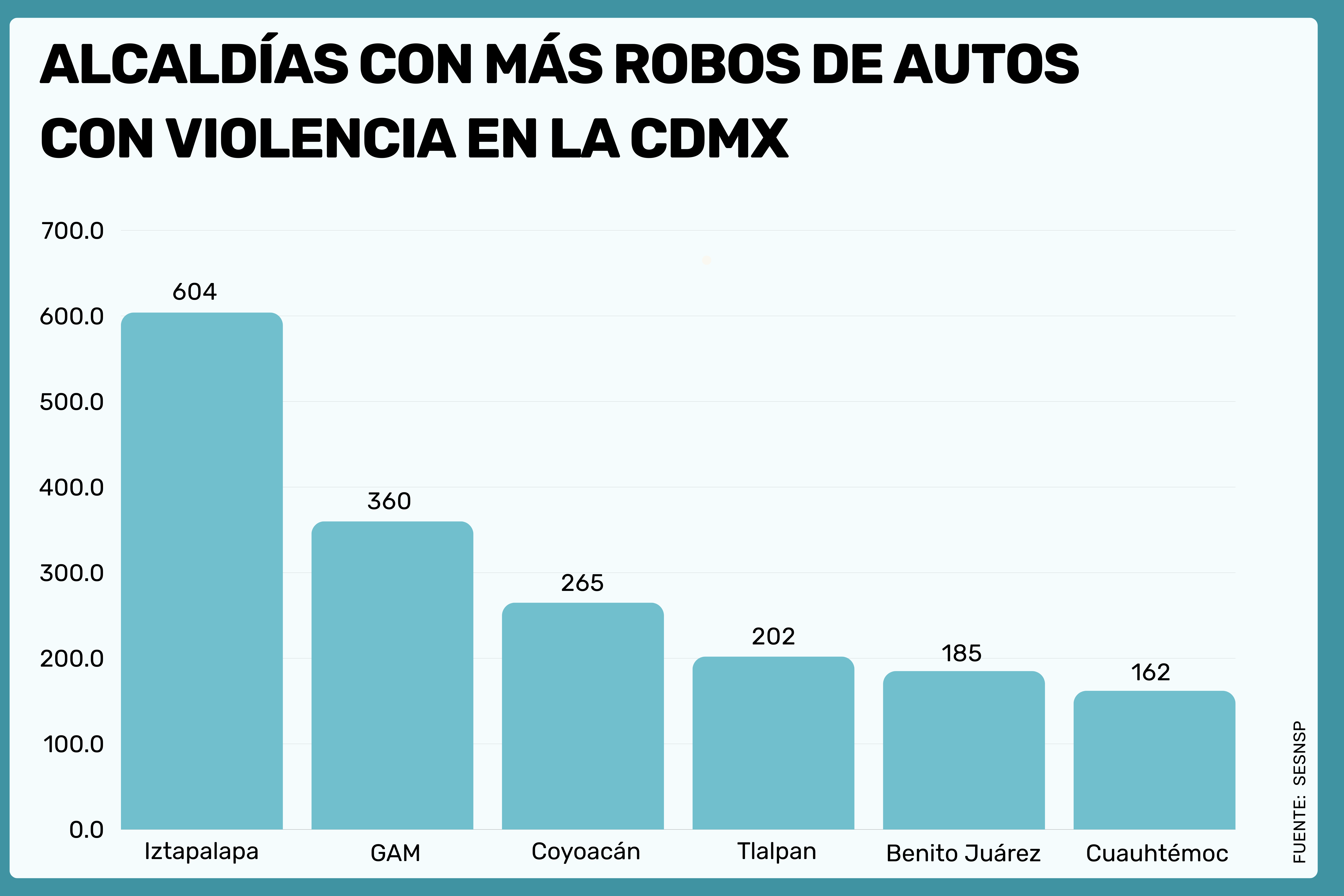 En lo que respecta al robo de autos en general, Iztapalapa y GAM vuelven a destacar con 604 y 360 denuncias respectivamente, aunque se suman también Coyoacán (265), Tlalpan (202), Benito Juárez (185) y Cuauhtémoc (162) en las estadísticas preocupantes.