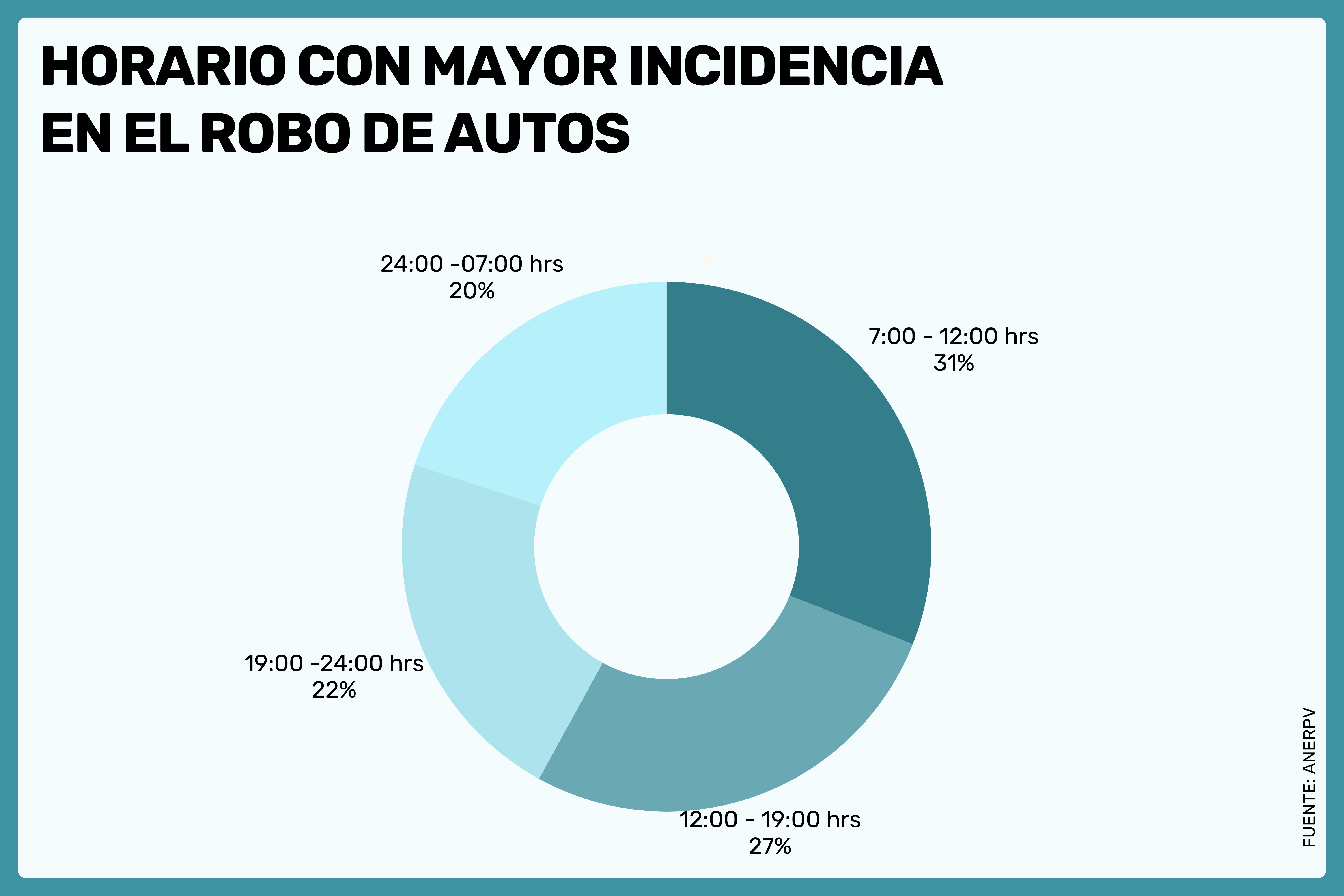 En este contexto, la Asociación Nacional de Empresas de Rastreo y Protección Vehicular (ANERPV) señaló que el horario matutino, particularmente de 7:00 a.m. a 12:00 p.m., emerge como un momento crítico para el robo de autos en México, siendo escenario de aproximadamente el 31% de los delitos. Esta franja horaria ha sido identificada como un período de actividad delictiva significativa, seguida de cerca por el intervalo de 12:00 p.m. a 7:00 p.m., que representa un 27% de los casos.