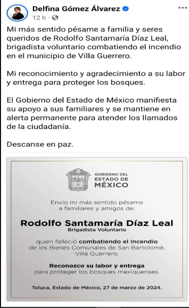 “Mi más sentido pésame a familia y seres queridos de Rodolfo Santamaría Díaz Leal, brigadista voluntario combatiendo el incendio en el municipio de Villa Guerrero. Mi reconocimiento y agradecimiento a su labor y entrega para proteger los bosques.”.