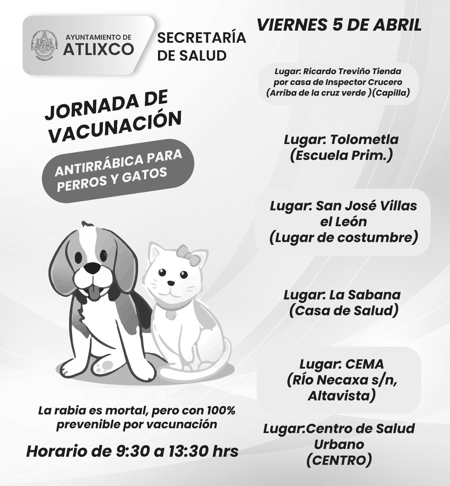 - Conoce las colonias donde estará la Jornada de Vacunación Antirrábica para Perros y Gatos en Atlixco.