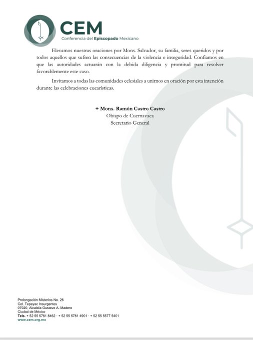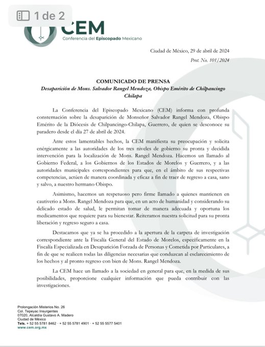 El Episcopado Mexicano informó que Salvador Rangel Mendoza, Obispo Emérito de la Diócesis de Chilpancingo-Chilapa, Guerrero, fue localizado con vida y se encuentra hospitalizado.