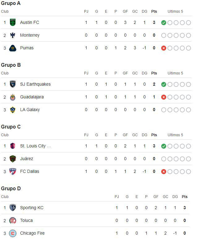 En el primer grupo el Austin FC es líder después de vencer a Pumas en la primera jornada, a esperas de enfrentar al Monterrey, llamado a ser uno de los candidatos al título. Las Chivas, en el grupo B, ocupan el segundo lugar con 1 punto después de perder en penales contra el San Jose Earthquakes.