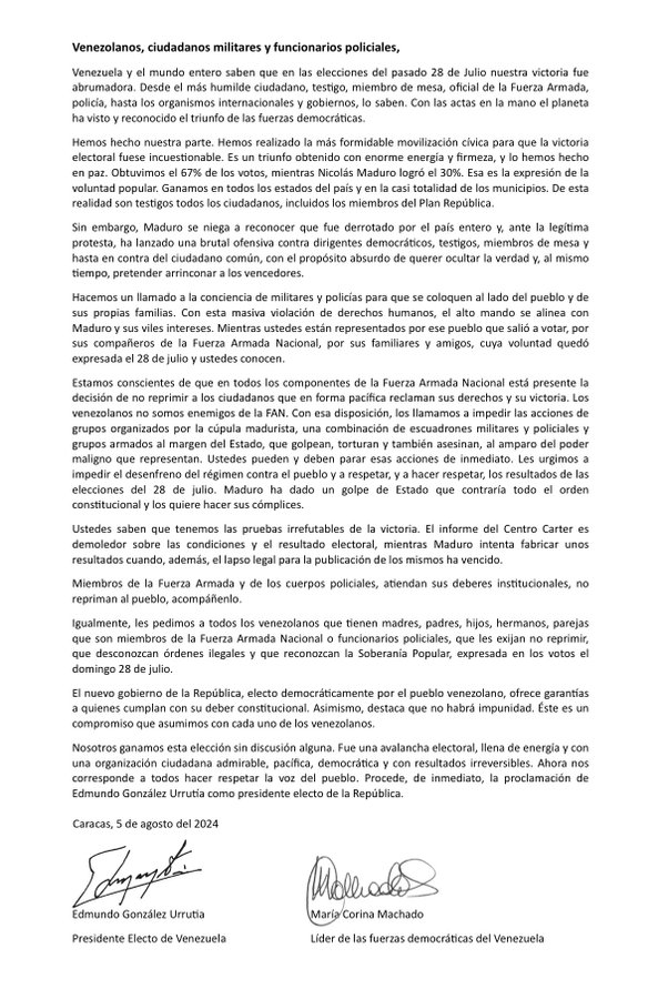 “Les urgimos a impedir el desenfreno del régimen contra el pueblo y a respetar, y a hacer respetar, los resultados de las elecciones”, indicaron.