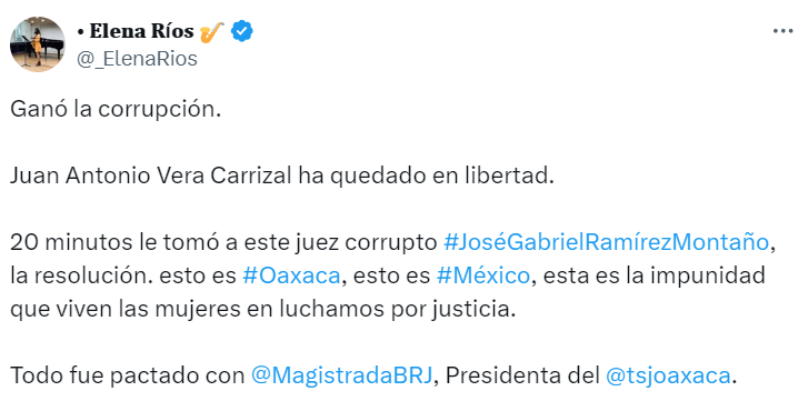 La saxofonista Elena Ríos (@_ElenaRios) informó que Juan Antonio Vera Carrizal, presunto autor intelectual del ataque con ácido en su contra, quedó en libertad: “Ganó la corrupción. Esta es la impunidad que viven las mujeres que luchamos por justicia”.