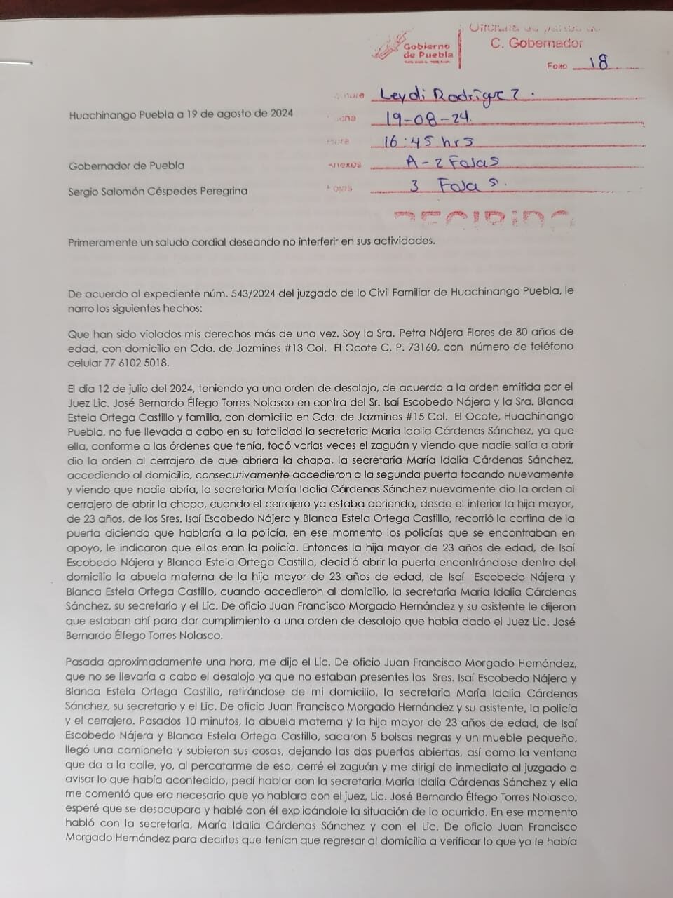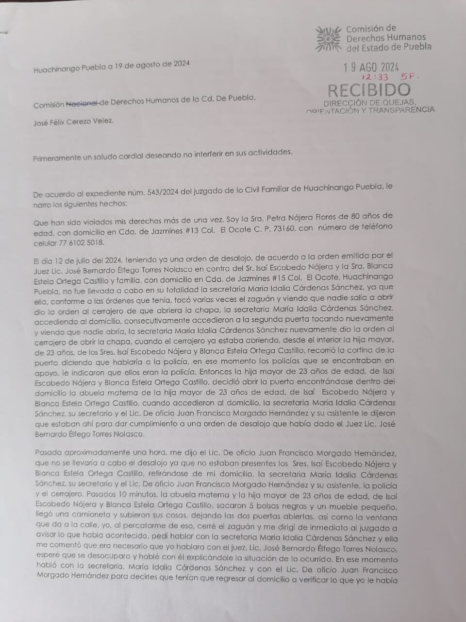 Petra Nájera, habitante del municipio de Huauchinango, denunció que se han violado sus derechos humanos y fue desalojada de su domicilio.