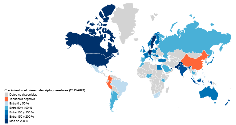 El aumento del número de poseedores de criptodivisas entre 2019 y 2024 fue especialmente marcado en varios países, como Asia, África y América del Norte. Entre los mayores aumentos, destaca la India, con una diferencia bruta de más de 200 millones de titulares, pasando de 109 millones en 2019 a 314 millones en 2024, seguida de cerca por Indonesia, que vio aumentar su número de titulares en 56 millones. En África, Nigeria también experimenta un fuerte crecimiento, con un aumento de 48 millones de titulares, lo que eleva el total a más de 104 millones.