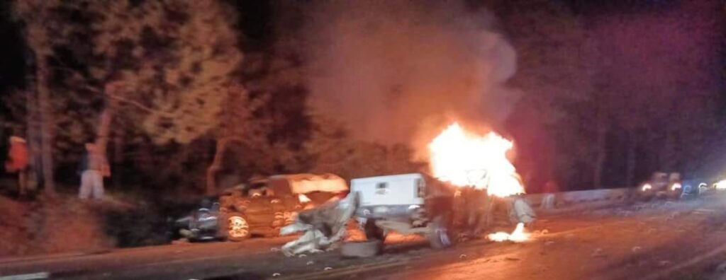 Así terminaron dos camionetas y un autobús de la línea Futura tras un fatal accidente sobre la autopista México Tuxpan a la altura del kilómetro 117+300 a la altura de El Tejocotal en Acaxochitlán, Hidalgo.