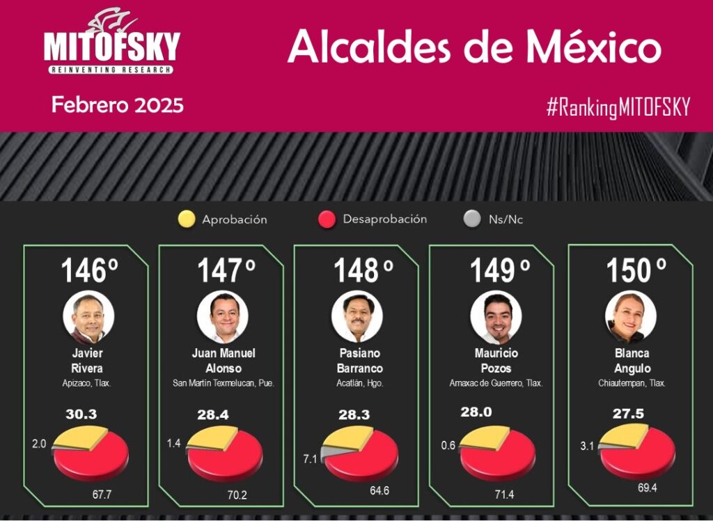 La falta de respaldo se extiende a otros municipios poblanos destacados, como Karla Martínez de Teziutlán, quien tiene una aprobación de 45.9% y una desaprobación de 52.3%. Por su parte, Alejandro Barroso, presidente de Tehuacán, solo cuenta con el 36.4% de aprobación y un notable 62.3% de desaprobación. En la misma línea, Juan Manuel Alonso de San Martín Texmelucan destaca por su baja aceptación, logrando un 28.4% de aprobación y un alarmante 70.2% de desaprobación, posicionándose en el lugar 147 del ranking.