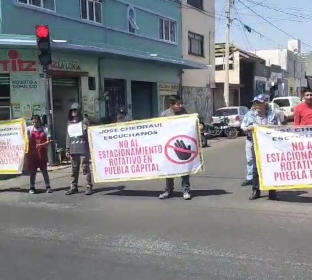 Este movimiento comenzó desde temprana hora en la calle 25 Poniente y 23 Sur, con pancartas en mano externaron su rechazo a este tipo de estacionamiento.