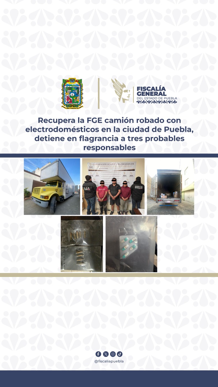 Como resultado de una acción inmediata de la Fiscalía General del Estado para atender una denuncia ciudadana en la que se reportó que en un domicilio de la colonia Jorge Murad de la ciudad de Puebla se ingresaba mercancía de dudosa procedencia, se realizó un operativo que permitió ubicar un camión reportado como robado cargado con electrodomésticos y la detención de tres personas.