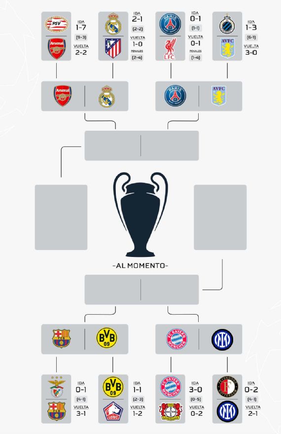 La mitad superior del bracket parece más fuerte con Arsenal, Atlético de Madrid, PSG y Real Madrid. Los Gunners jugarían contra el ganador del derbi madrileño en cuartos de final.