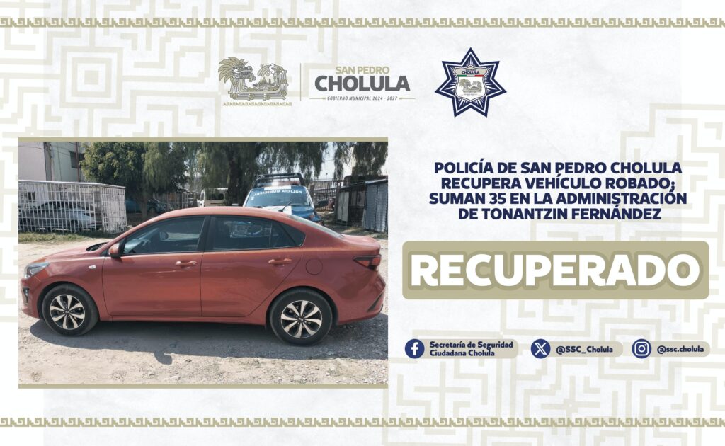 *13 de marzo, 2025. San Pedro Cholula, Pue.-* Como resultado de diversas estrategias implementadas para localizar vehículos con reporte de robo en San Pedro Cholula, la Secretaría de Seguridad Ciudadana (SSC Cholula), ha recuperado un total de 35 automóviles, en el periodo que comprende de octubre de 2024 a marzo de 2025, aunado a ello, 12 personas han sido detenidas por su probable participación en hechos con apariencia de delito relacionados a estos casos.