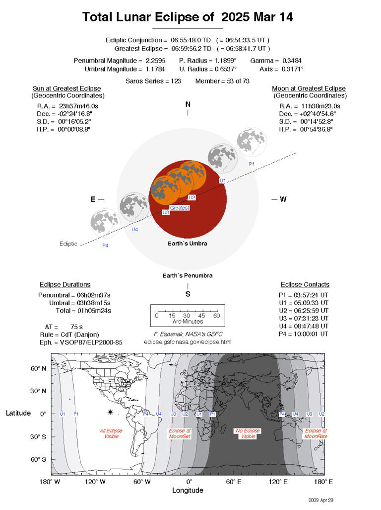 El eclipse lunar total será el viernes 14 de marzo de 2025. De acuerdo con la Administración Nacional de Aeronáutica y el Espacio, mejor conocida como NASA , informó que habrá dos eclipses lunares totales en 2025, el 14 de marzo y el 7 de septiembre. Sin embargo, solo el primero será visible en América, Europa Occidental y África occidental. Según el Explorador de Eclipse lunares de la NASA, predice que en México empezará alrededor de las 21:57 horas del jueves 13 de marzo de 2025; entrará en su fase parcial a las 23:10 y en fase total a las 00:26 horas hasta las 00:59 del viernes 14 de marzo. Eclipse lunar total Eclipse lunar parcial Eclipse penumbral