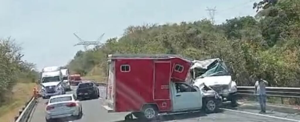 Choque frontal entre un camión Torton Freightliner de color blanco con caja seca contra una camioneta Silverado Chevrolet pick up color blanco, ambos vehículos utilizados para transporte de carga se impactaron frontalmente a la altura del kilómetro 199 de la autopista México–Tuxpan en el tramo de Tihuatlán.