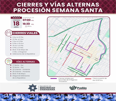 La Secretaría de Seguridad Ciudadana (SSC) informa que, el viernes 18 de abril del año en curso, la Dirección General de Control de Tránsito, realizará cierres totales a la circulación a partir de las 07:00 hasta las 16:30 horas por recorrido de imágenes Procesión de Viernes Santo 2025, mismo que se realizará en las principales calles del Centro Histórico.