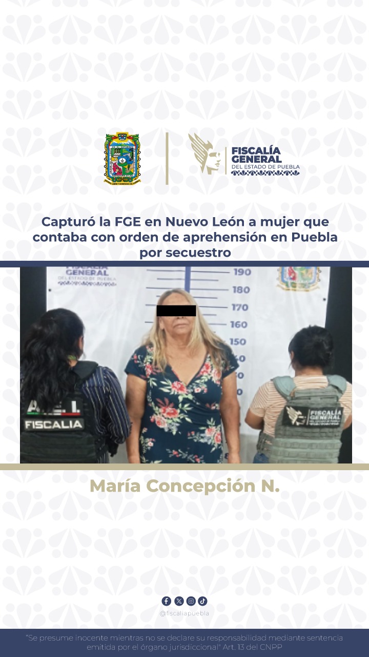 La Fiscalía General del Estado de Puebla, ubicó y aprehendió en el estado de Nuevo León, a María Concepción N., por su probable responsabilidad en el delito de secuestro agravado ocurrido en la ciudad de Puebla.