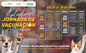 A través del CEMA y en coordinación con la Secretaría de Salud del Estado, continúa la jornada de vacunación en colonias y juntas auxiliares del municipio. La vacuna es gratuita, no requiere cita y se aplica a mascotas desde los dos meses de edad.
