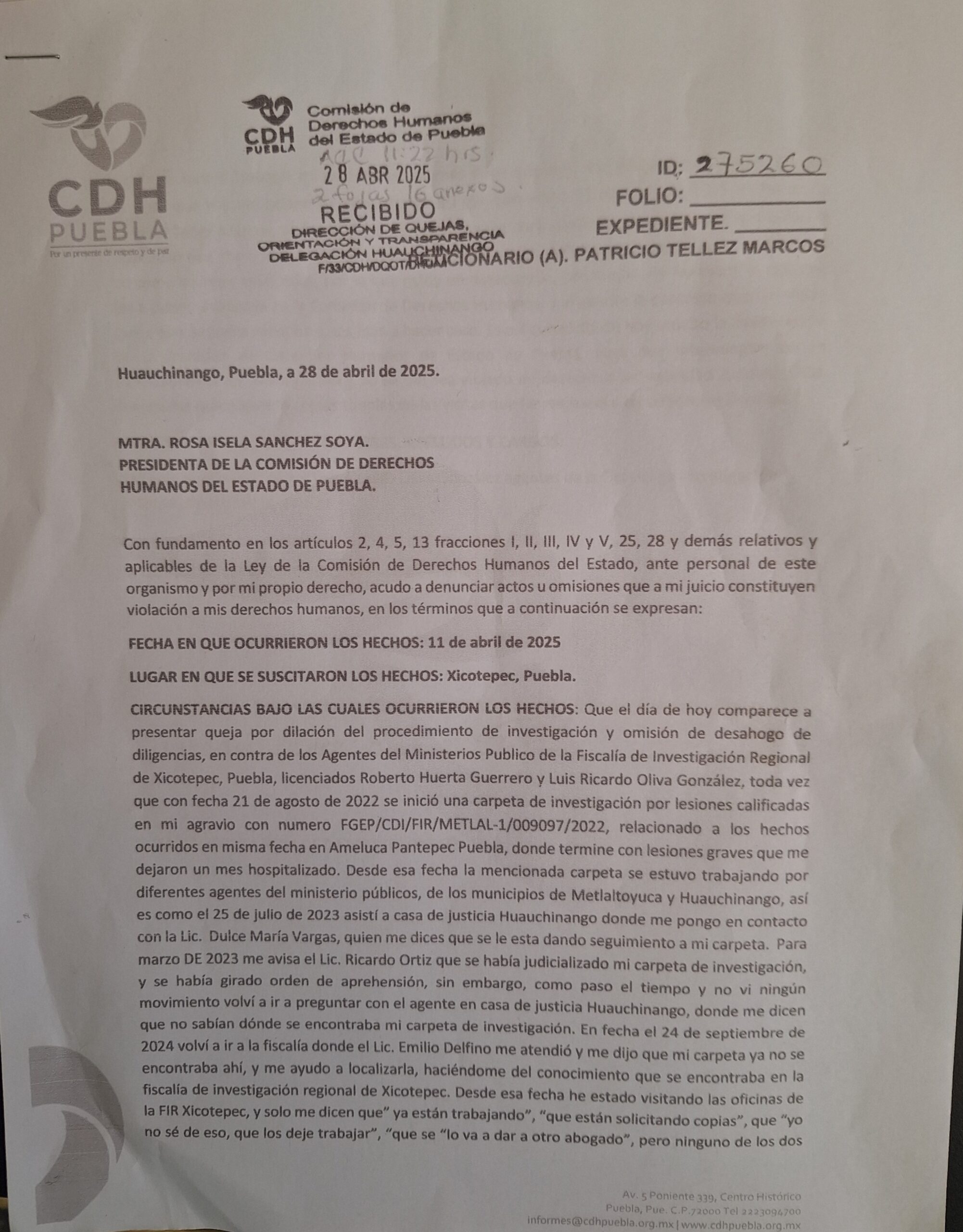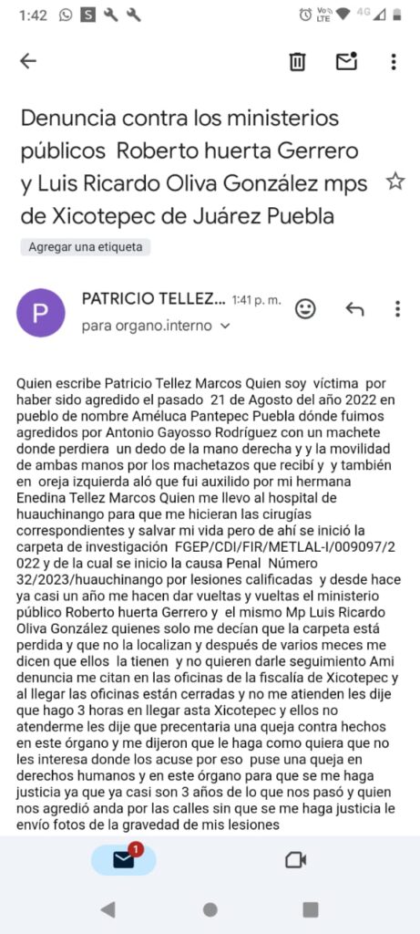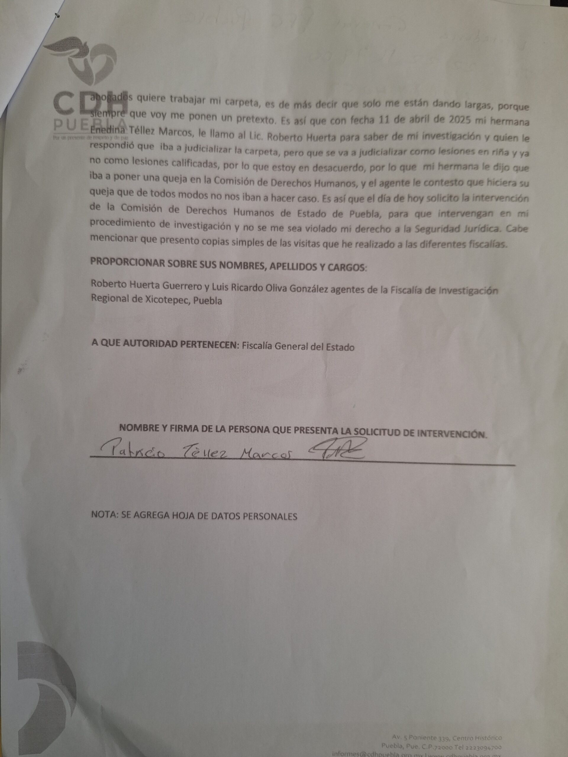 Por ello, el día de hoy acudió a la Comisión de Derechos Humanos para presentar queja contra los MPS Roberto Huerta Guerrero y contra el MP Luis Ricardo Oliva González, quienes solo los citan en las oficinas de Xicotepec de la fiscalía y nunca están o no son atendidos.