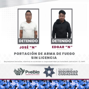 En una segunda acción, policías de la ciudad aseguraron a Edgar “N”, de 27 años de edad, y a José “N”, de 29 años de edad, en la colonia Constitución Mexicana, por presuntamente portar un arma de fuego sin el permiso correspondiente, así como diversos cartuchos útiles.