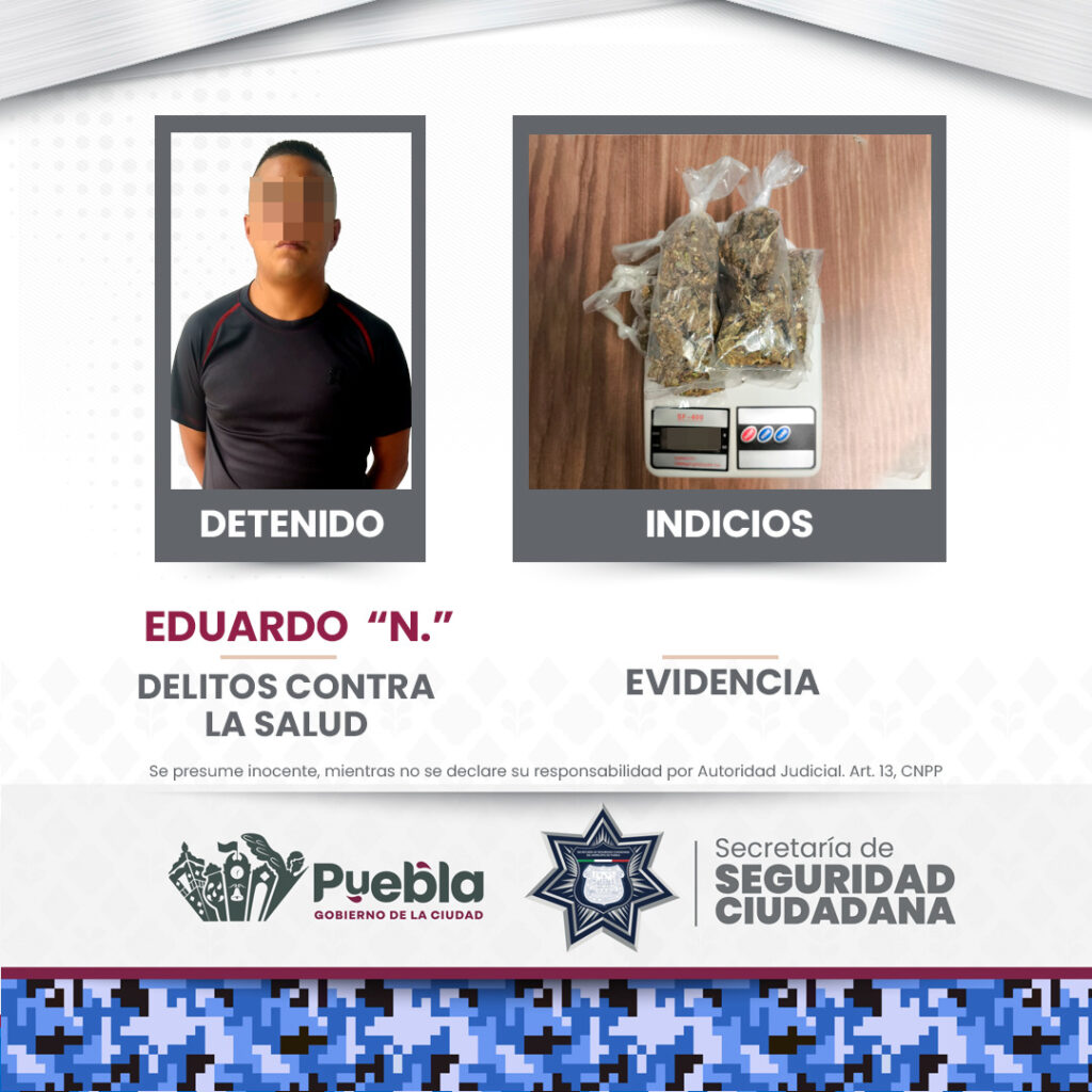Durante el despliegue territorial, se detuvo a Eduardo “N”, de 28 años de edad, quien presuntamente llevaba diversas bolsas transparentes que en su interior contenían hierba verde con características similares a la marihuana.