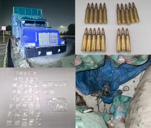 Además, aseguraron un camión con placas de circulación de Guerrero y con los medios de identificación alterados, así como un contenedor de gas LP con capacidad para ocho mil litros, oculto en material para reciclar (PET), cartuchos útiles y envoltorios con posible droga.