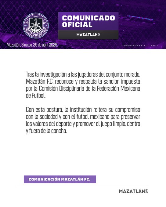 “La Comisión Disciplinaria de la Federación Mexicana de Futbol informa que realizó una detallada investigación por la posible manipulación de partidos correspondientes al Torneo Clausura 2025 de la Liga BBVA MX Femenil, de parte de jugadoras del Club Mazatlán FC”