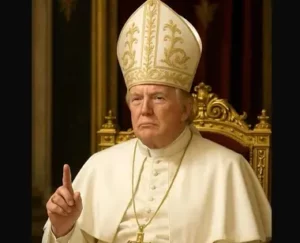 La foto a color difundida por Trump en su red Truth Social lo muestra sentado con aire solemne en un sillón, vestido con la sotana blanca papal, coronado con la mitra y luciendo la imponente cruz de oro. Tiene la mano izquierda apoyada en el muslo y el índice derecho levantado hacia el cielo.