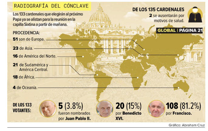 Tan es así que 108 de los 133 cardenales electores fueron nombrados por Francisco. Es decir, 81.2% de quienes elegirán al próximo Papa.