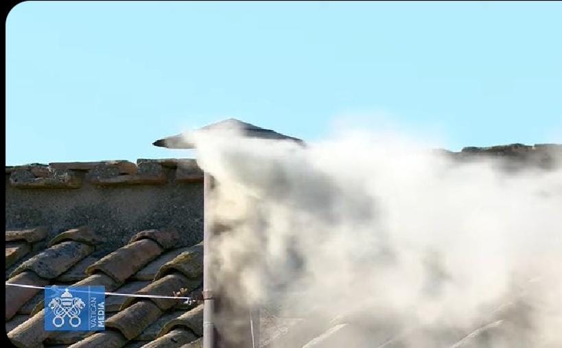 El esperado humo blanco surge de la chimenea instalada en el tejado de la Capilla Sixtina.