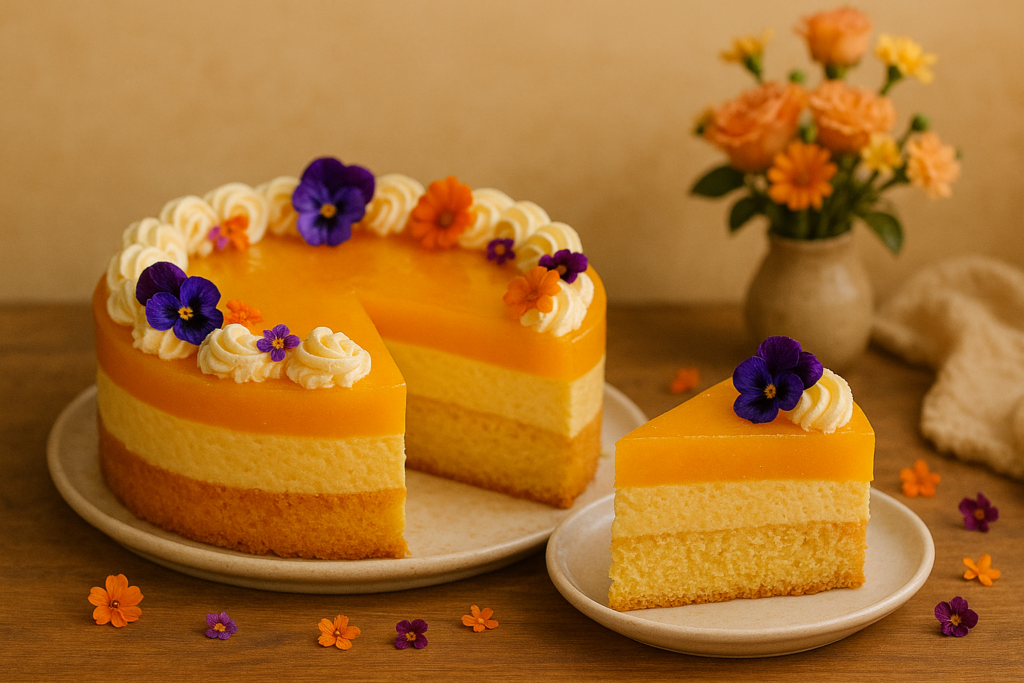 - Desmolda con cuidado y decora con crema batida y flores comestibles en la superficie.