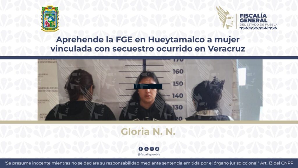 La Fiscalía General del Estado de Puebla cumplimentó una orden de aprehensión en contra de Gloria N. N., de 18 años de edad, acusada del delito de secuestro agravado, ocurrido en el estado de Veracruz.