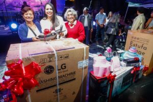 Como parte del evento, la presidenta municipal encabezó una rifa de atractivos premios, que incluyeron pantallas, lavadoras, estufas, vajillas y regalos sorpresa, todos sorteados mediante una tómbola.