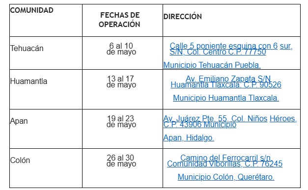 Dr. Vagón visitará los municipios de Tehuacán, Puebla, Huamantla, Tlaxcala, Apan, Hidalgo y Colón, Querétaro, para ofrecer servicios médicos gratuitos a más de ocho mil personas durante mes de mayo.