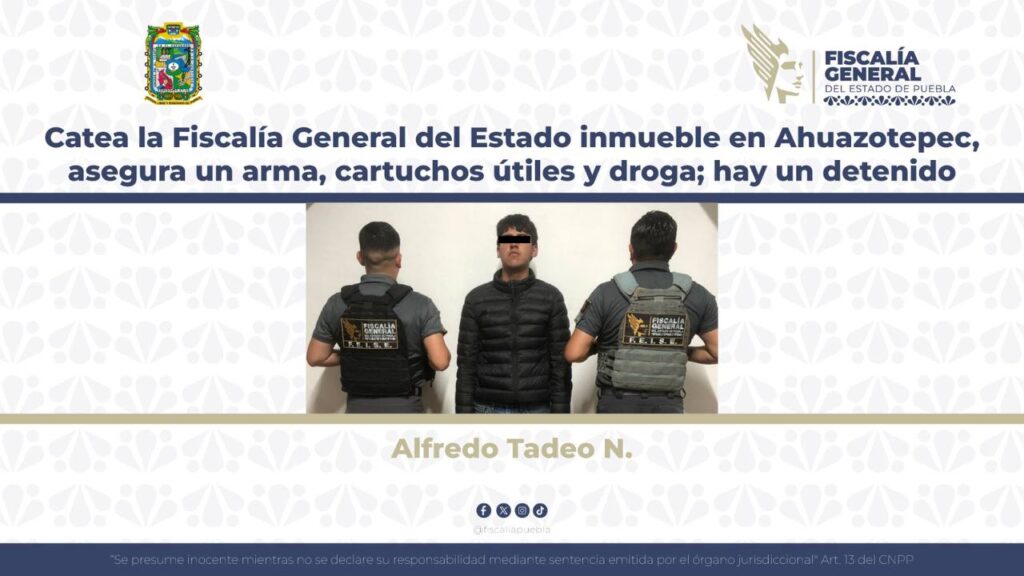 La Fiscalía General del Estado ejecutó un cateo en un inmueble ubicado en el municipio de Ahuazotepec, Puebla, donde aseguró un arma de fuego, cartuchos útiles de diferentes calibres y droga (marihuana y cristal), deteniendo a una persona por delitos contra la salud y posesión de cartuchos de uso exclusivo del Ejército, Armada y Fuerza Aérea.